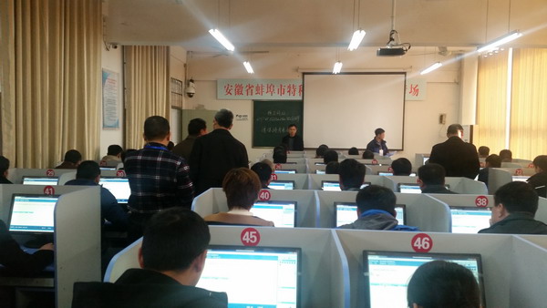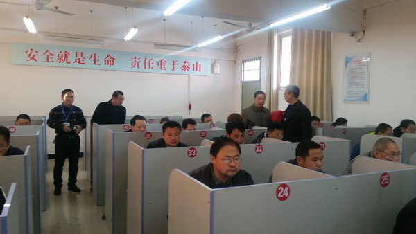陈元高、宋晓宾在校成人教育培训处处长陈佩喜的陪同下,进入培训机房巡查,这里正在进行特种作业人员安全操作资格鉴定考试。考场内安静有序,80名特种作业人员(电工、焊工、安全管理人员)正在上机考试,监考人员前后站位尽职尽责。陈元高认真查看了考试情况,要求考务人员严肃考试纪律,确保考试工作圆满完成。随后,陈元高来到基地办公室,检查了培训相关资料,要求成人教育培训处严格遵守国家的培训政策,进一步扩大培训规模,同时对培训鉴定的档案资料提出了规范性要求,对基地立足人力资源产业园开拓培训市场、抢抓发展机遇提出指导意见。检查结束后,陈元高对培训基地的工作情况表示满意。