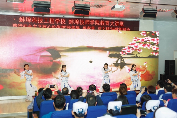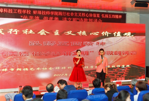 “轻轻地我走了,正如我轻轻地来……”。舞台上在深情朗诵,观众们在舞台下轻声和着,大家在徐志摩的诗歌里陶醉。这里是5月4日晚蚌埠市朗诵艺术协会和蚌埠科技工程学校共同举办的“践行社会主义核心价值观 弘扬五四精神”诗歌朗诵会现场。学校领导陈元高、郝登峰、卢嘉瓅、包太平、陈劲松以及蚌埠市朗诵艺术协会领导出席并观看了演出。