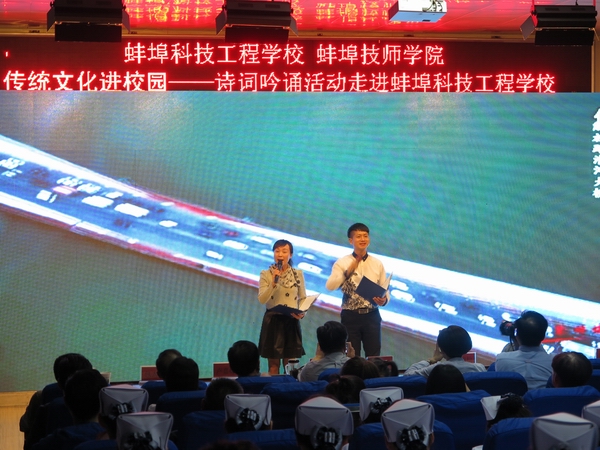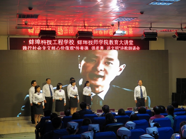 朗诵会上,朗诵者们声情并茂地演绎了李白、舒婷、徐志摩、林觉民等古今中外众多名家的名篇佳作,或抒情款款,或沉郁悲凉,或慷慨豪迈,再配上适合诵读内容的音乐伴奏,让在场观众享受了一场精彩的文化大餐:《妈妈,我等了你二十年》用饱含深情的朗诵把大家带入了那悲情时刻,让观众们泪光闪闪;《淮河,我的母亲河》、《蚌埠,我深深爱着的家乡》又引起观众强烈共鸣,激起了热爱家乡的情怀;《与妻书》、《沉马》体现了先烈们为实现理想而视死如归、为完成事业而临危不惧的英雄气概;《古诗联诵》激情饱满,洋溢着诗意的青春与阳光。朗诵者们激情满怀,一首首诗歌诵读得热情洋溢,荡气回肠!在朗诵间隙又穿插了舞蹈、古筝、歌唱等节目,使诗歌朗诵会节目丰富多彩,热度一再提升。一曲杨国祥老师的《万里长城永不倒》点燃了大家的热血,全场多次响起热烈的掌声。