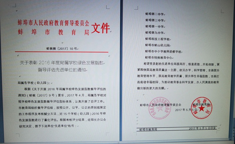 近日,市人民政府教育督导委员会、市教育局印发了《关于表彰2016年度局属学校绿色发展指数督导评估先进单位的通知》,蚌埠科技工程学校(安徽蚌埠技师学院)再次被评为先进单位。这是我校继2013年以来连续第四次获此殊荣。