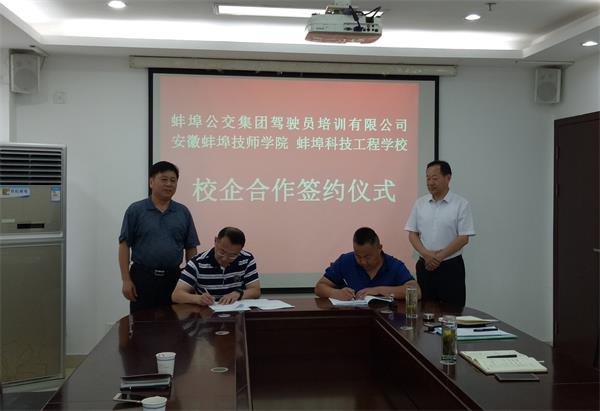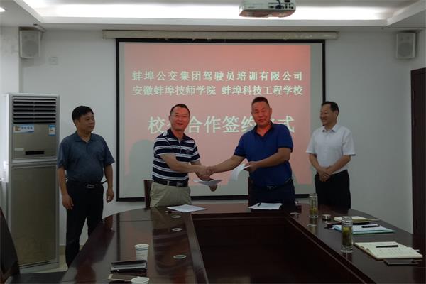 2017年6月21日下午,“安徽蚌埠技师学院(蚌埠科技工程学校)和蚌埠公交集团驾驶员培训有限公司校企合作签约仪式”在蚌埠公交集团驾驶员培训有限公司会议室隆重举行。出席本次签约仪式的有蚌埠公交集团有限公司副总经理冯永勤、公交驾校校长孙鹤、副校长沈连强、崔向魁,安徽蚌埠技师学院(蚌埠科技工程学校)党委书记郝登峰、副校长宋晓宾、机电工程系主任焦其彬、副主任高龙等。