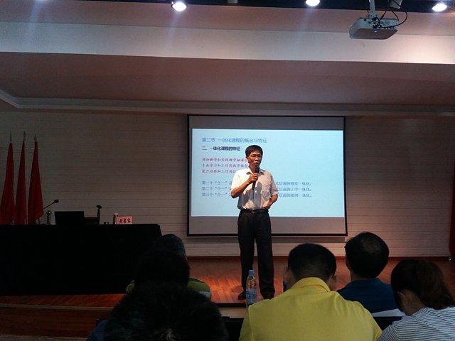 黄景荣教授首先引用陶行知先生的话“职业学校之课程,应以一事之始终为一课”作为开场,阐述了一体化课程开发的重要性。其次,黄教授围绕一体化课程教学、一体化教学场地与设备、一体化课程标准、一体化教师培养、一体化教材开发等五部分内容作详细介绍,并引用大量实例进行剖析。在互动环节上,黄教授就在场老师提出的问题作一一解答,并就课程实施的各步骤提出了详细建议。