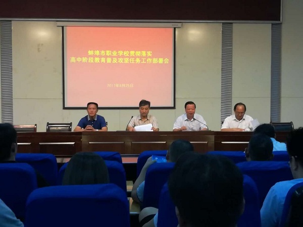 部署会上,我校招就办帅恒松主任就职业学校参与攻坚任务活动的各项具体工作做了详细的说明,市教育局职成科曹华月副科长传达了市教育局李凯副局长对此项工作的重要指示,强调所有参与人员一定要充分认识到此项工作的重要性,树立职业教育一盘棋观念,严禁走过场,摆花架子,要切实负起责任,相互配合,深入到各个中学认认真真、扎扎实实地做好此次任务的各项工作。陈劲松副校长要求所有参与宣传的人员在工作中要克服各种不利因素,认真做好宣传工作。陈元高校长就此次贯彻落实高中阶段教育普及攻坚任务,对所有参与人员提出希望和要求,一要认真学习、深入领会8月22日蚌埠市教育局召开的2017年高中阶段教育普及攻坚任务工作推进会的精神。二要认真按照市教育局的指示精神,做实、做细各项工作,扎实做好宣传、报名、网上填报等工作。三是要发扬拼搏精神,团结协助,共同促进蚌埠市职业教育的发展。(校招就办供稿)
