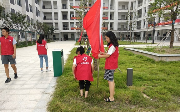 每节课大课间,可以看到我校志愿者的身影出现在学校各个角落,他们捡起地上的烟头、纸屑以及建筑垃圾,同时他们制止着学生的不文明行为,维护校园彩旗以及展板的整洁。