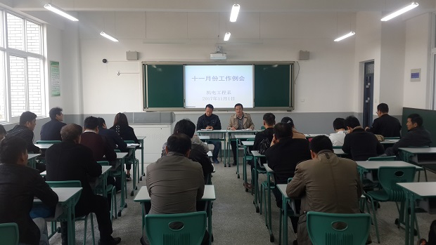 2017年11月1日下午3:50,安徽蚌埠技师学院(蚌埠科技工程学校)机电工程系在校实训楼北二楼205多媒体教室召开了十一月份工作例会。会议由机电工程系主任焦其彬主持,系副主任王秀军、高龙以及全体教师参加了此次例会。