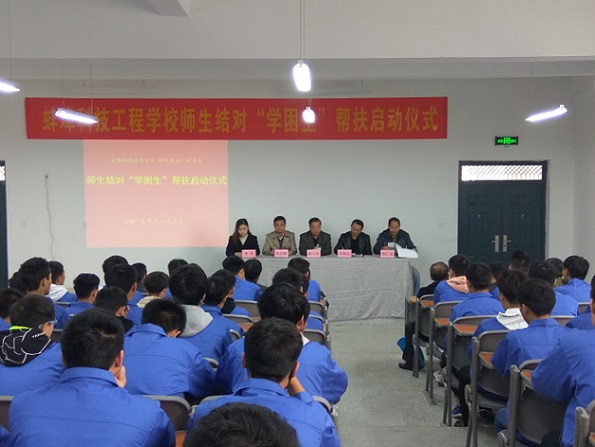 为了更好的发挥先进模范作用,建立和谐师生关系。我校于2017年11月3日上午在南教学楼阶梯教室开展了蚌埠科技工程学校师生结对“学困生”帮扶启动仪式,参加启动仪式的有蚌埠科技工程学校校长陈元高、副校长宋晓宾、机电工程系主任焦其彬、校团委李雯及相关结对教师,会议由学生处郭仁龙处长主持。