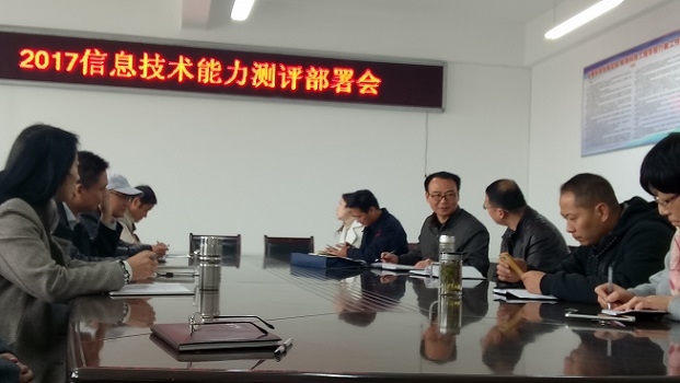为了落实《安徽省教育厅关于做好2016年度中小学教师信息技术应用能力提升培训工作的通知》(皖教秘师[2016]40号)和安徽省《关于组织开展2016年度中小学教师信息技术应用能力发展测评工作的通知》(皖教师资函[2017]14号)及蚌埠市教育局《关于组织开展蚌埠市2016年度中小学幼儿园教师信息技术应用能力发展测评工作的通知》文件精神。我校于2017年11月14日上午在行政楼四楼会议室召开了“信息技术能力测评部署推进会”。参加此次会议的有分管教学的宋晓宾副校长,教科研处全体人员,各部门、各系部主要负责同志。