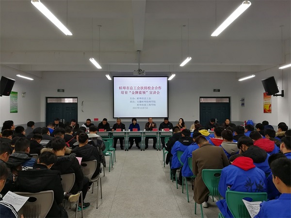 为落实蚌埠市总工会扶持校企合作培育“金牌蓝领”计划的相关工作,2017年12月7日下午,在安徽蚌埠技师学院 蚌埠科技工程学校会议室,召开了培育“金牌蓝领“宣讲会。市总工会副主席沈玉玲,市总工会保障部部长陈又丁,我校宋晓宾副校长及相关部门负责人,蚌埠金威滤清器有限公司、安徽柳工集团、安徽今上显示玻璃有限公司、安徽雪郎生物科技有限公司、中航三鑫太阳能光电玻璃有限公司五家意向合作企业的相关负责人参加了此次会议。此次宣讲会由蚌埠市总工会主办,安徽蚌埠技师学院 蚌埠科技工程学校承办。