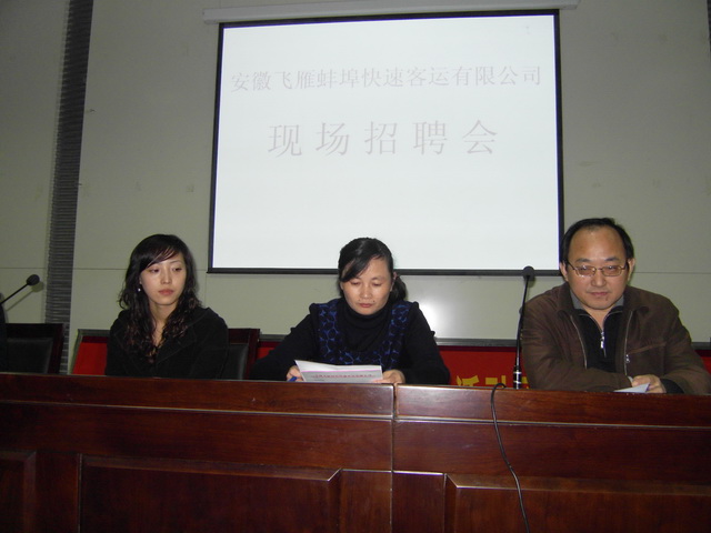 为做好安徽飞雁蚌埠快速客运有限公司在我校的首次招聘工作,开拓校企合作的新途径,提升我校在本市就业安置的质量,校招生就业办积极在广大学生中进行宣传发动,组织了70余名学生报名参加。经过由安徽飞雁蚌埠快速客运有限公司经理、车队队长及车队班长组成的招聘小组的初试、复试及公司领导的面试,周文静等四名同学被录用,唐静、高银燕、葛凡、陈文文、陈梦莹等五位同学为后备乘务员。(职教中心招就办:帅恒松)