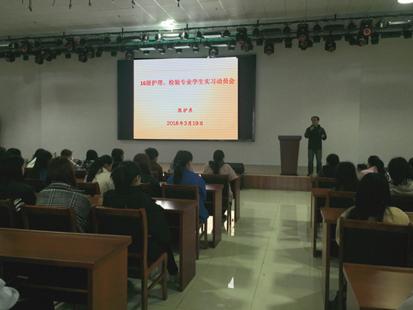 为进一步做好2016级实习学生的岗前培训工作,帮助学生克服实习前的焦虑情绪,做好从学生到职场工作者的角色转换,3月19日下午,我校医护系在多功能报告厅召开了2016级护理、医学检验专业实习动员大会,医护系王玮主任、吴雪红主任,2016级全体班主任以及即将实习的学生260余人参加会议,会议由王玮主任主持。