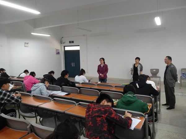 在北教学楼阶梯教室,校领导认真细致地巡查各个考场,检查考场秩序,认真询问考试组织情况,督促监考老师认真履行监考职责,确保考试顺利进行。巡查的过程中,各考场秩序井然,监考教师认真负责,考场井然有序,学生应考沉着、守纪。