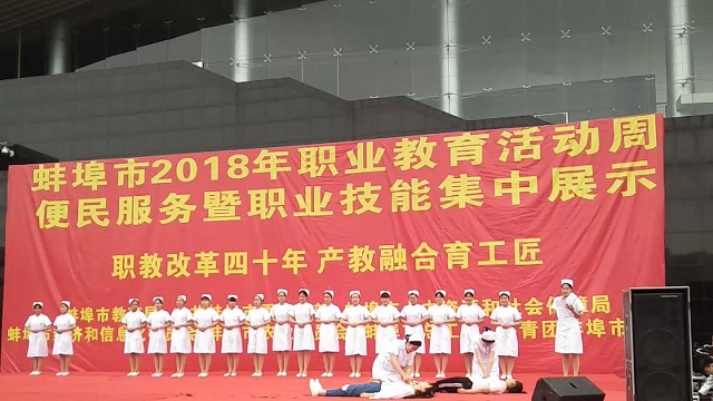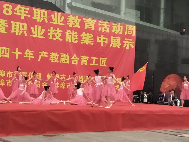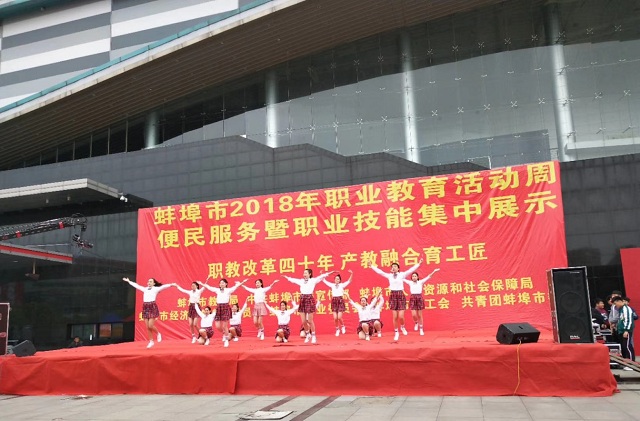 5月7日上午八点,蚌埠市2018年职业教育活动周便民服务暨职业技能集中展示活动在蚌埠淮河文化广场举行。本届职业教育活动周主题是“职教改革四十年,产教融合育工匠”。由我校精心准备的三个舞台了节目参加了本次舞台表演