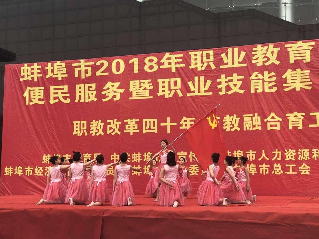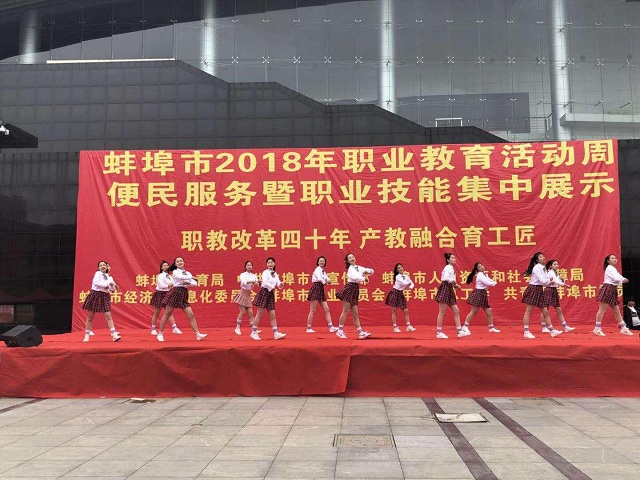 5月7日上午,蚌埠市2018年职业教育活动周——便民服务暨职业技能集中展示活动在淮河文化广场举行,公共服务系学前教育、西点、人物形象三个专业的学生参与了展示活动。