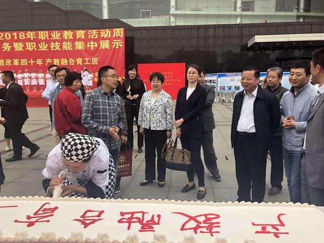 活动中,市教育局乌兰琪琪格局长、李凯副局长一行来到我系展台、驻足观看、并对西点造型蛋糕给予了充分的肯定、并对专业的发展提出了具体的建议。学前教育专业学生表演开场舞《红旗颂》及舞蹈《舞春晓》,整体造型由人物形象专业学生完成,青春靓丽、充满活力。西点专业学生现场制作大型蛋糕裱花,书以“产教融合育工匠”致敬职教改革四十年。