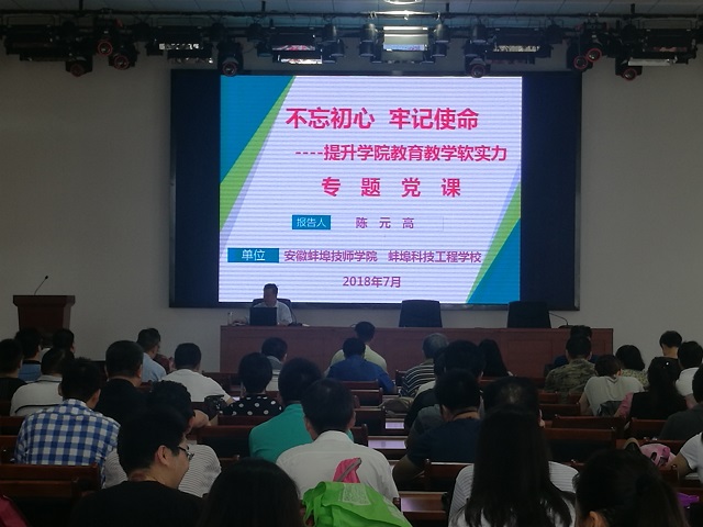 6月27日上午,校长、校党委副书记陈元高以“不忘初心 牢记使命——提升学院教育教学软实力”为主题,在信息楼二楼学校多功能报告厅为全体党员上了一场专题党课。党课由校党委委员、副校长宋晓宾主持。