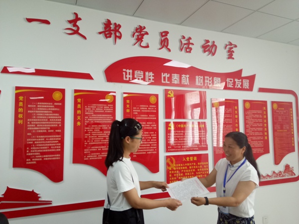 2018年7月10日,在建党97周年的日子里,在蚌埠科技工程学校一支部党员活动室内,一支部教职工王君老师向组织递交了入党申请书。
