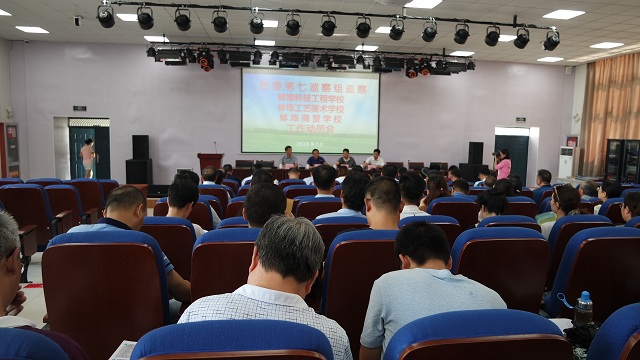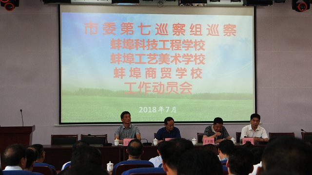 7月17日下午3:30,市委第七巡察组巡察工作动员会在蚌埠工艺美术学校会议室召开,我校领导与工艺美校、商贸学校领导及三所学校的中层干部参加了动员会。会上,第七巡察组组长朱顺义作了动员讲话,市教育局总督学王光辉主持会议并作了表态发言。