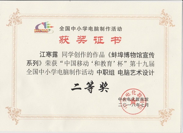 此次,由教育部中央电化教育馆主办的第十九届全国中小学电脑制作活动在江苏无锡举行,历时5天,来自全国的1600余名中小学生,参加了数字创作评比、机器人竞赛、创客竞赛等多个项目的角逐。江寒露同学创作的《蚌埠博物馆宣传系列》作为安徽省唯一一个入选中职组电脑艺术设计项目全国决赛作品,在经过了技术测试和现场答辩两场比赛后,得到专家们一致好评,荣获全国二等奖。