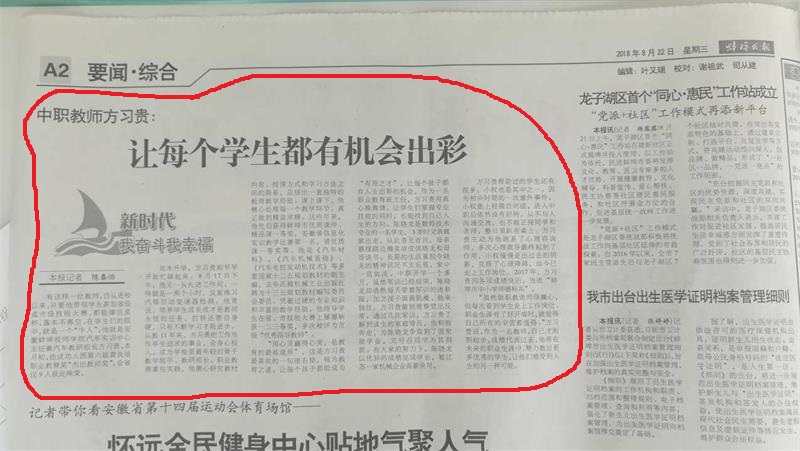 2018年8月22日,蚌埠主流媒体《蚌埠日报》在其A2版要闻·综合栏以较大篇幅刊登了题为“中职教师方习贵:让每个学生都有机会出彩”的专题宣传报道,通过介绍其先进事迹,赞誉我校成功入围全国第六届黄炎培职业教育奖“杰出教师奖”的青年优秀教师方习贵。