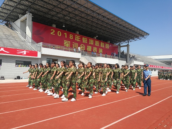 2018年8月29日,职教园区操场上军容整齐、喊声震天,身穿迷彩、活力四射的学子们整装待发。2018级新生军训会操总结大会在这里隆重举行。部队管理参谋,蚌埠市教育局领导、园区领导、18级全体班主任老师们出席了大会。此次会操表演由我校分管德育陈劲松副校长主持。