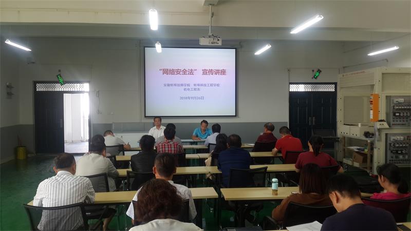 为深入贯彻《中华人民共和国网络安全法》,推进网络信息安全建设,营造安全、健康、文明、和谐的网络环境。 9月26日下午3:45分,机电工程系在学校实训西楼201室召开《网络安全法》宣传讲座,系主任焦其彬主持会议,全系教师参加。