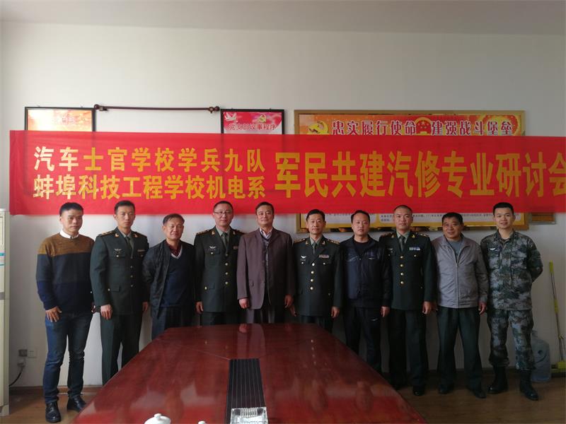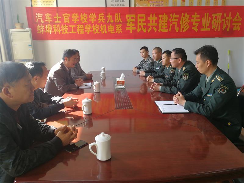 为积极响应蚌埠市双拥模范城市创建,落实我校双拥创建工作,2018年10月31日,蚌埠科技工程学校机电工程系在焦其彬主任的带领下赴汽车士官学校双方共同举办军民共建汽修专业研讨会。