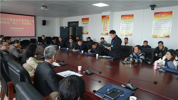 11月10日,2018年安徽省企业钳工高技能人才研修班在我院如期开班。上午8:30举行了开班仪式,学院副院长宋晓宾致欢迎词,机械工程系主任王旭、培训处处长陈佩喜分别就培训具体安排和技能鉴定工作作了说明并提出了工作要求。安徽粮食经济技师学院许国平代表学员作了发言。