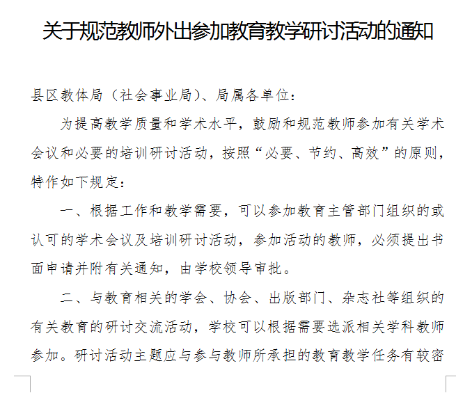 现转发市教育局2018年11月16日印发的《关于规范教师外出教育教学研讨活动的通知》,请遵照执行!