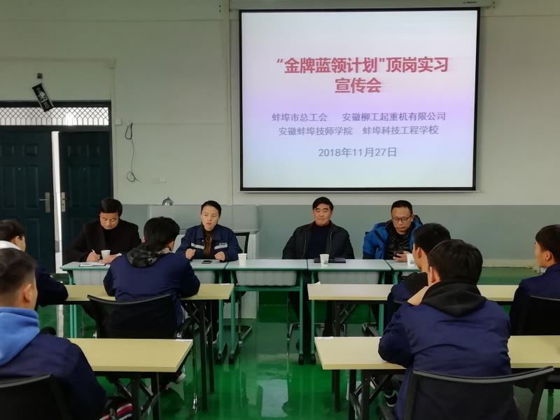 11月27日下午3:00,机电工程系在学校实训西楼201室组织召开了“金牌蓝领计划”顶岗实习宣传会,会议由机电工程系主任焦其彬主持,安徽柳工起重机有限公司技术服务部服务总监吴磊等三位领导参加, “金牌蓝领计划”安徽柳工起重机有限公司定向培养22名学生参加会议。