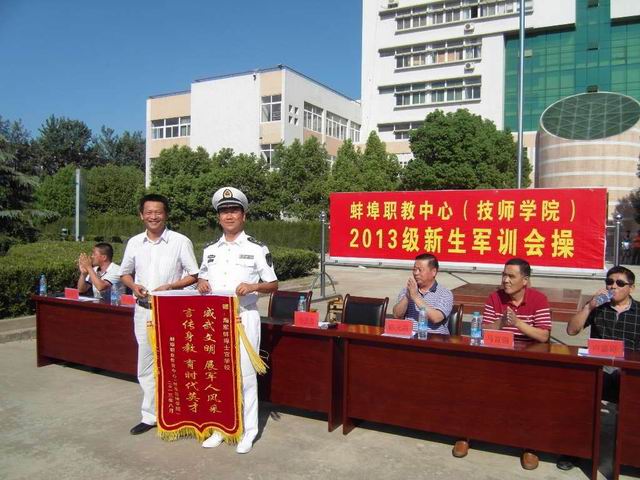 会操结束后,陈元高校长对军训工作作了总结讲话,胡业武书记代表学校向海军蚌埠士官学校二大队赠送锦旗,海军蚌埠士官学校二大队李政委致辞,张玉琳副校长宣读了学校《表彰2013级新生军训标兵的决定》和各班军训会操比赛成绩,校领导为获得“军训标兵”称号的学生和获奖班级颁奖。