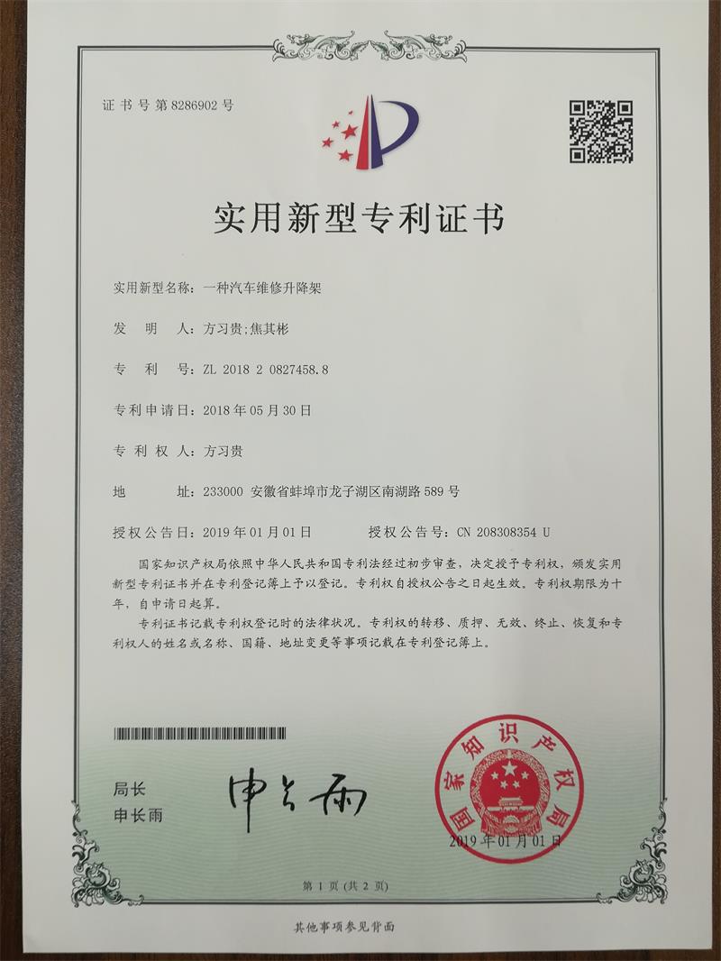 日前,从国家知识产权局获悉,我校教师方习贵、焦其彬申报的一项实用新型专利获得国家知识产权局授权,此项专利名称为“一种汽车维修升降架”,专利号为ZL201820827458.8。