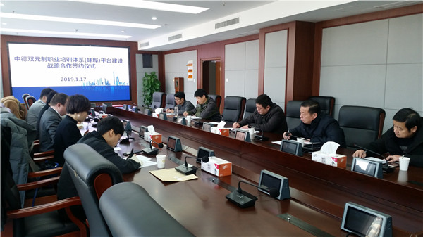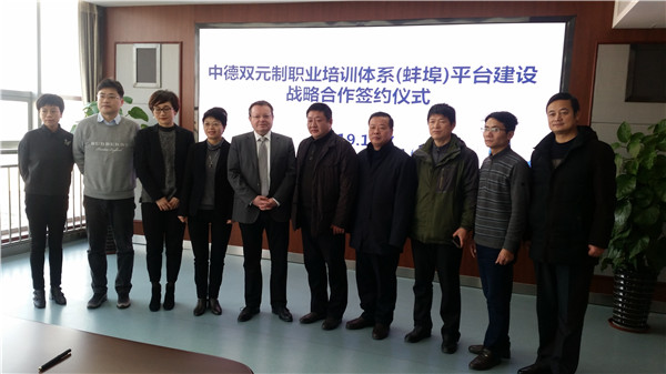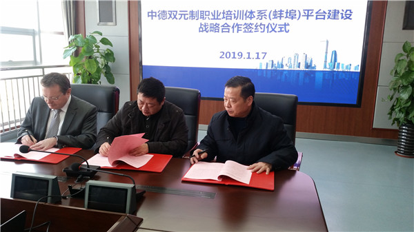由市人社局牵头,蚌埠技师学院与德国安克礼公司经过考察和磋商,达成了实施中德双元制职业培训体系(蚌埠)平台建设的战略合作协议。2019年1月17日上午,合作签字仪式在市人社局举行,蚌埠市人社局副局长朱冬民主持仪式并致欢迎词,蚌埠技师学院院长陈元高与安克礼公司负责人埃里希·鲍尔教授出席仪式并签字。