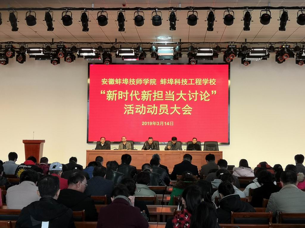 为了全面落实市委《蚌埠市新时代新担当大讨论活动实施意见》文件精神,开展好“新时代新担当”大讨论活动。3月14日,我校举行了“新时代新担当”大讨论活动动员大会,学校领导班子和全体教职工参加了动员大会。