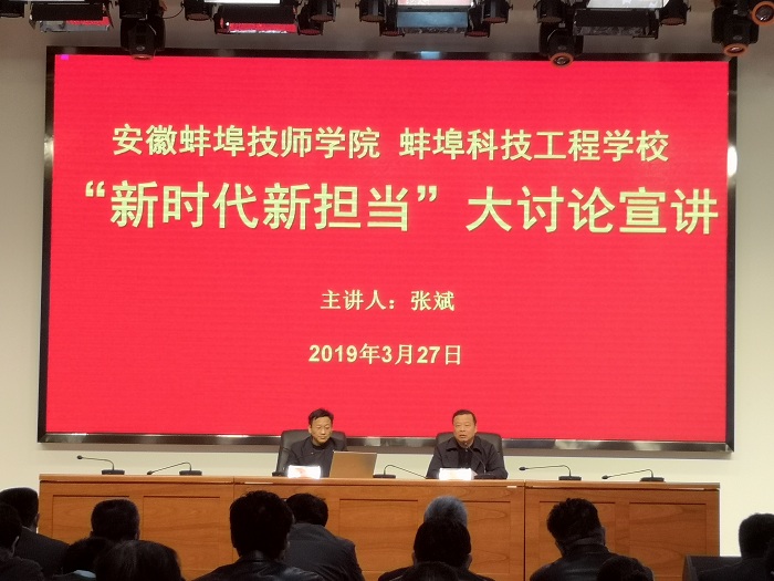 2019年3月27日下午,我校开展“新时代新担当”大讨论宣讲活动,特邀市委政策研究室张斌副主任为我校全体教职工举行主题为“对标中心找差距、立足自身勇担当”的宣讲。陈元高院长主持会议并做动员讲话。