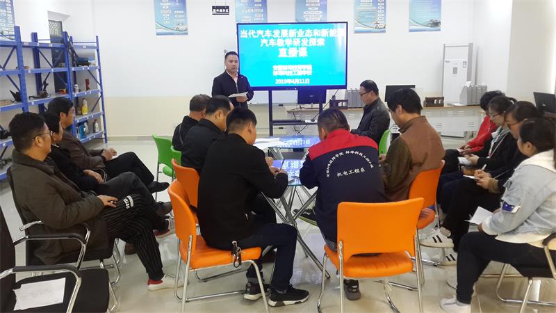 为贯彻落实《安徽省人民政府办公厅关于深化产教融合的实施意见》,促进教育与新型产业有效对接,推进技工院校工学一体化教学改革,培育适应新兴产业发展的实用型高技能人才,安徽省职业技术培训协会于2019年4月11日下午2:00举行“当代汽车发展新业态和新能源汽车教学研发探索”现场观摩暨网络直播活动,我校机电工程系积极组织专业负责人、专业教师等20余人全程收看了现场直播,宋晓宾副校长莅临现场在线观摩指导。