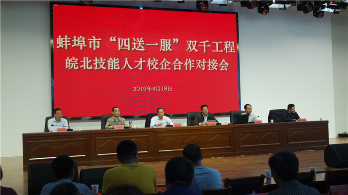 4月18日,蚌埠市“四送一服”双千工程校企合作对接会在我院多功能报告厅隆重举行。省、市“四送一服”双千工程工作组成员、省人社厅职业能力建设处主要负责人及相关人员,市政府副秘书长,市人社局负责人,省内10所技师学院主要负责人,市属各区人社局负责人,市区100余家企业负责人出席对接会。我院领导、各部门负责人及部分师生200多人参会。会议由市政府副秘书长王传鹏主持。