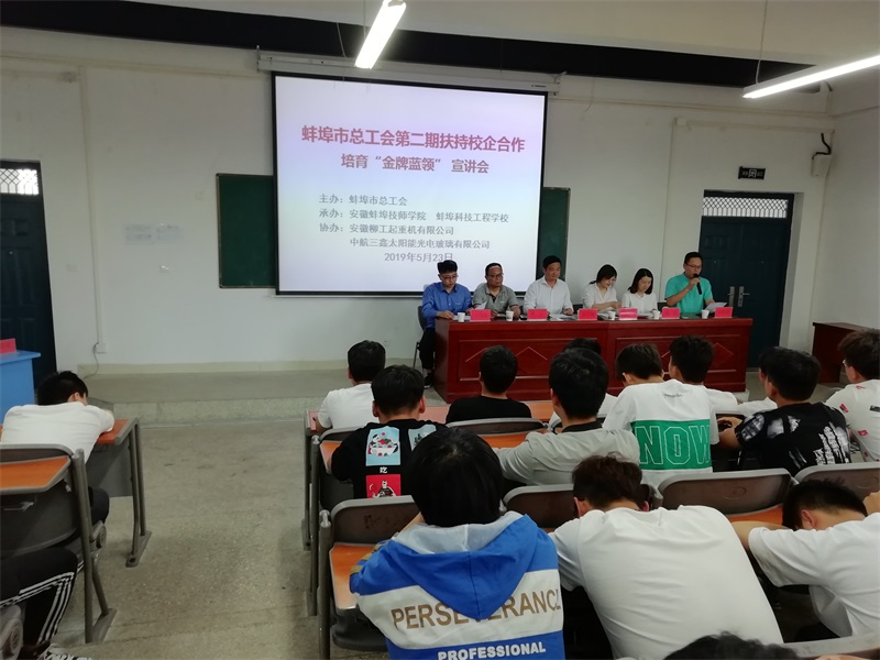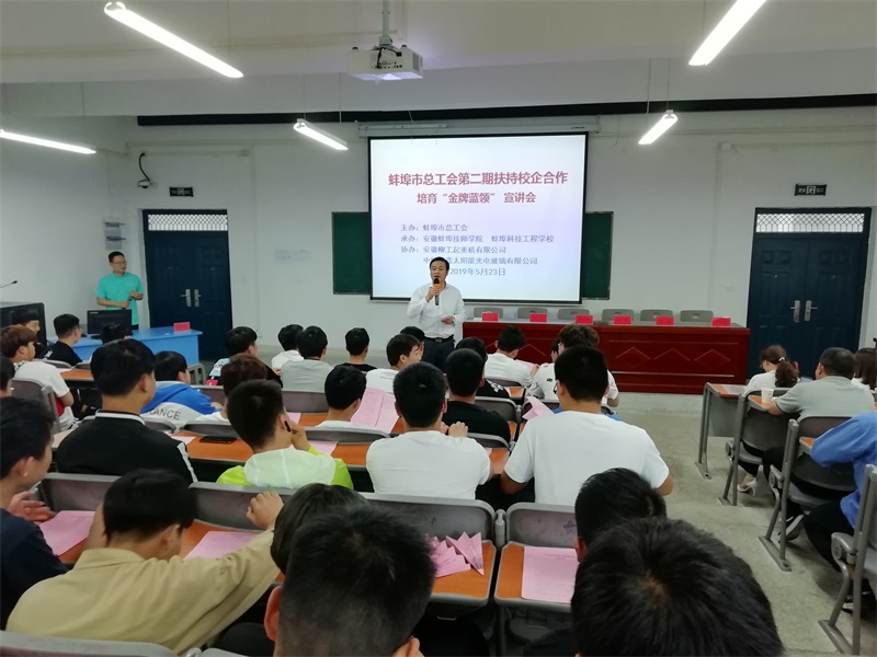 为切实推进蚌埠市总工会第二期扶持校企合作培育“金牌蓝领”计划的相关工作,2019年5月23日下午,在学校教学西楼107多媒体教室,安徽蚌埠技师学院 蚌埠科技工程学校组织召开了蚌埠市总工会第二期扶持校企合作培育“金牌蓝领”宣讲会。