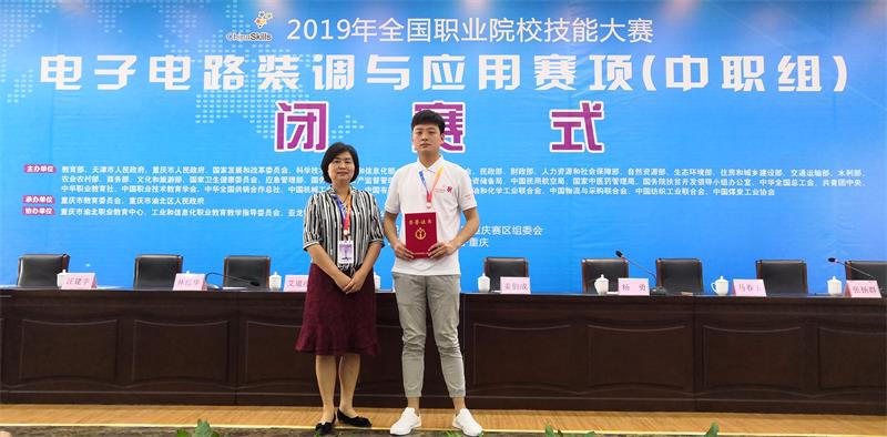 5月29日—5月31日,2019年全国职业院校技能大赛(中职组)电子电路装调与应用赛项在重庆市渝北职业教育中心举行,来自全国37个省、直辖市、自治区及计划单列市的共104名参赛选手同台竞技,经过激烈角逐,我校周少梅老师指导的学生杜浩宇喜获国赛三等奖(排名第36名)。