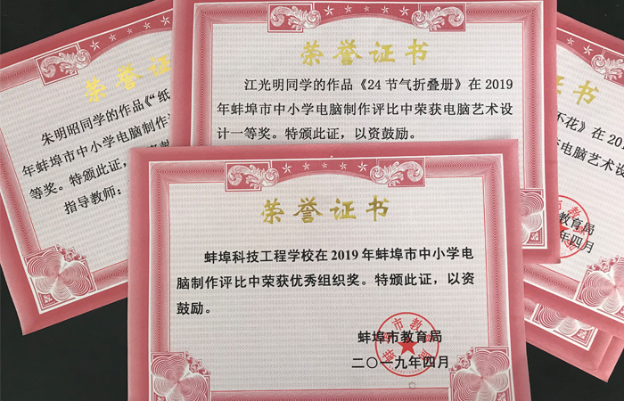 近日,由市教育局举办的2019蚌埠市中小学电脑制作活动已经圆满落下帷幕。经过专家对各单位推荐的716件作品进行认真的评审,共评出一等奖64件,二等奖122件,三等奖245件。我校精选了5件电脑艺术制作作品和1件二维动画作品参赛。此次活动6件作品全部获奖,其中一等奖2个,二等奖1个,三等奖3个。王颖和张克老师获优秀指导教师奖,此成绩位列蚌埠市中职学校第一名。