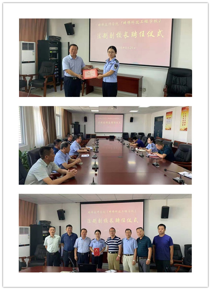 8月29日我校法制副院长聘任仪式在我院行政楼三楼会议室举行。我院领导班子成员,淮上区吴小街司法所所长黄秀出席活动。
