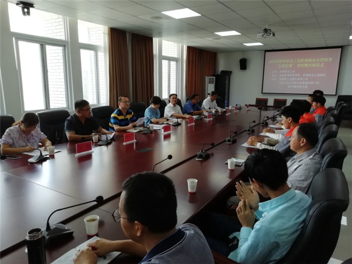 会中,在欢快的背景乐曲声中,市总工会、学校、企业签订了三方培养协议。