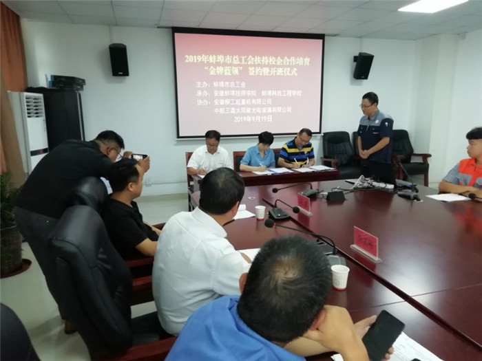 9月19日下午3时,2019年蚌埠市总工会扶持校企合作培育“金牌蓝领”签约及开班仪式在我校隆重举行,仪式由我校机电工程系主任焦其彬主持。蚌埠市总工会副主席沈玉玲、保障部部长陈又丁、安徽柳工起重机有限公司副书记陆凤超、中航三鑫太阳能光电玻璃有限公司行政人事部副经理王旭、安徽蚌埠技师学院 蚌埠科技工程学校校领导宋晓宾等多位政校企领导、机械工程系和机电工程系17级“金牌蓝领”各班班主任及学生参加了此次开班仪式。