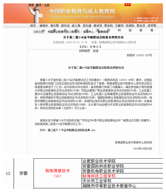 日前,教育部职业技术教育中心研究所发布了《关于第二批1+X证书制度试点院校名单的公告》(教职所〔2019〕257号),全国共批准特殊焊接技术职业技能等级证书第二批1+X证书制度试点院校155所,我校成功入围第二批试点特殊焊接技术职业技能等级证书院校。