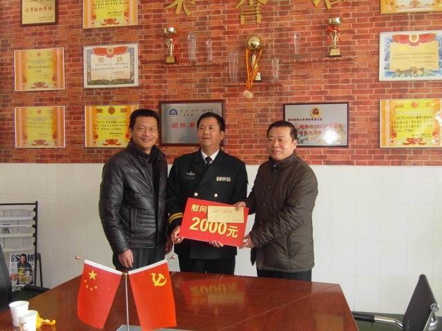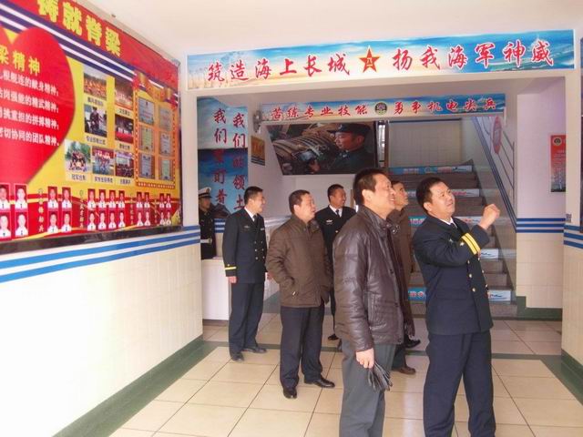 2014年1月6日上午,在农历马年新春到来之际,校领导陈元高、胡业武、马富强、张玉琳等一行5人,到军民共建单位—海军蚌埠士官学校学员二大队走访慰问,受到二大队李政委等官兵的热情欢迎。校领导代表学校向二大队送上了2000元慰问金,以表达对二大队官兵的崇高敬意和多年来对我校无私帮助的诚挚感谢。
