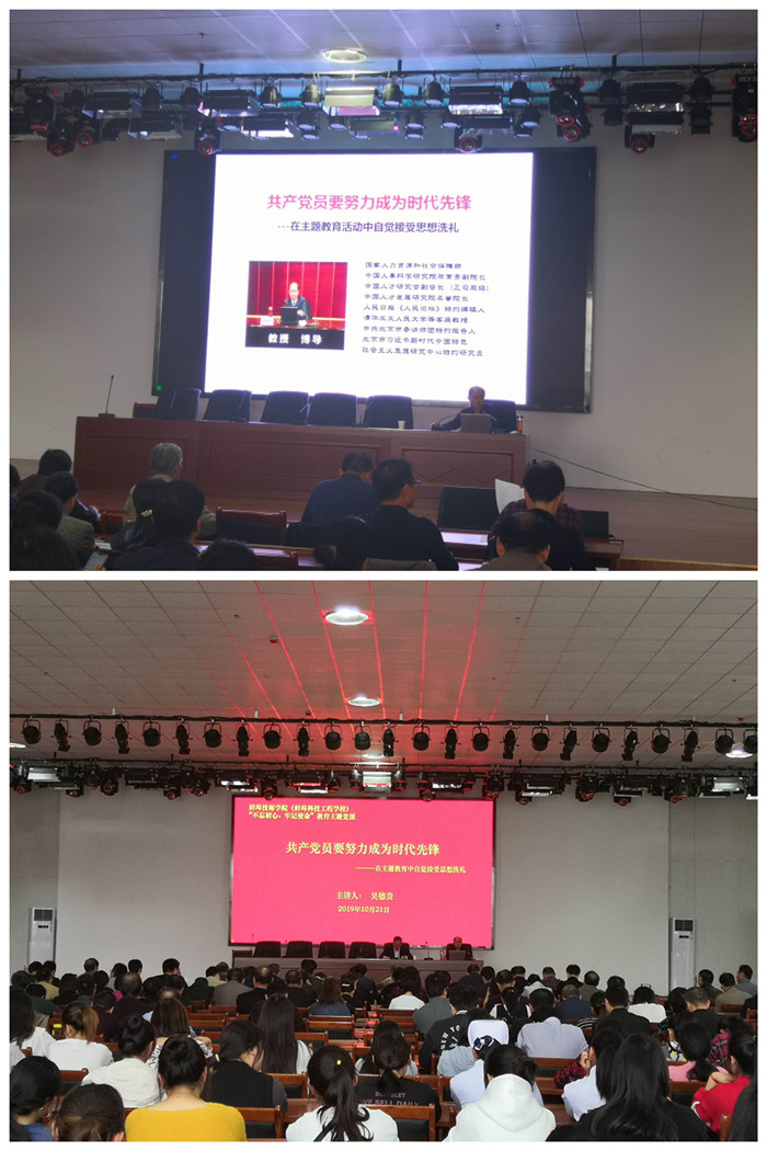 为进一步把“不忘初心、牢记使命”主题教育抓紧抓实,做到理论学习有收获。10月21日下午,我校聘请了原国家人力资源和社会保障部中国人事科学研究院常务副院长、研究员、教授、博士后导师吴德贵同志,来我校上了“共产党员要努力成为时代先锋”专题党课。全校党员,教师和部分学生代表参加了党课学习。