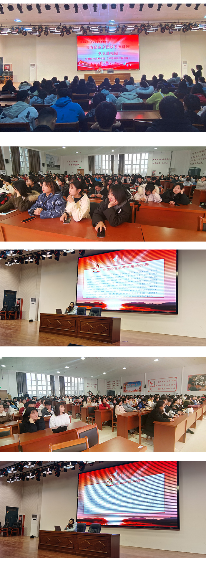 11月27日下午,在党的十九届四中全会召开及全校深入开展“不忘初心、牢记使命”主题教育之际,由安徽蚌埠技师学院(蚌埠科技工程学校)校团委组织开展的“不忘初心、牢记使命”主题教育暨“党史进校园”业余团校主题讲座活动在报告厅举行,校团委教师们及200余名团员参加活动,由校团委李雯老师进行宣讲。