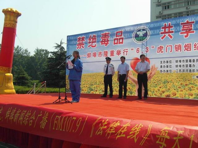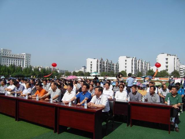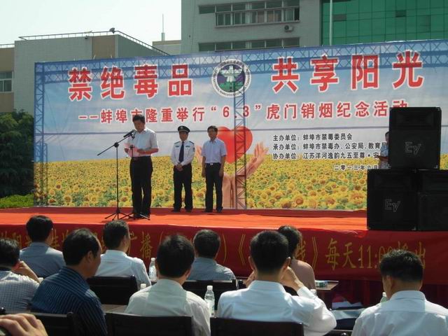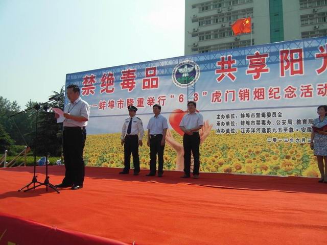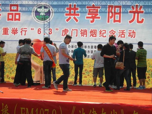 活动在我校运动场举行。8:30时分,与会人员陆续进场,各校学生在运动场中间列队,运动场四周悬空宣传气球随风飘动,运动场正东搭起了主席台,“禁绝毒品,共享阳光”的主题背景在阳光映照下格外醒目。与炎热的天气一样,现场气氛浓郁热烈。