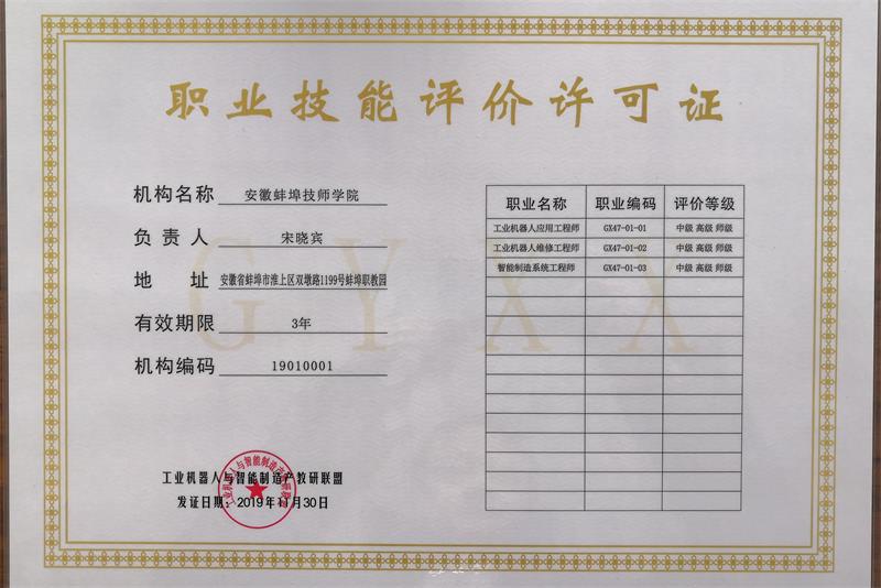 全国工业与信息技术考试管理中心、工业机器人与智能制造产教研联盟于2019年9月25日联合发文《关于同意建立“智能制造职业技能评价考试站”和“智能制造职业技能评价技术支持单位”的批复》(工信考[2019]2号)。我校成功获批建立“智能制造职业技能评价考试站”,安徽蚌埠技师学院院长宋晓宾任站长。