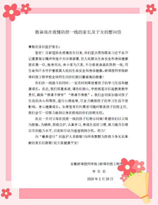 接到《蚌埠市中等职业学校新冠肺炎疫情防控开学工作指南(二)的通知》后,其中提到要做好防疫一线医护人员子女的关怀工作,我院高度重视,迅速行动,由学生处负责组织班主任统计,学校有8名学生的家 长参与到新冠肺炎疫情医护防控一线,其中3名学生的父母亲均在防控一线。为让抗疫一线的家长们安心战“疫”,学生处代表学校给抗疫一线的家长及子女写了一封慰问信,告知家长学院对孩子的关心和安排,由班主任以电话或微信的方式传达。