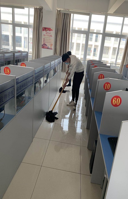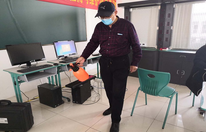 4月26日是我院对口高考班报道的日子。由于疫情影响,无法组织教职工集中培训,王玮主任利用网络学习的方式,传达了《职教园新冠肺炎防控培训》的相关文件。其次根据学校的要求,需要对机房实训室全面消杀。班主任带领学生首先对实训室进行通风,然后清扫地面,使用消毒水拖地,擦洗键盘鼠标,最后运用消毒水喷洒地面,做到全屋无死角。(电子信息工程系 肖莹)